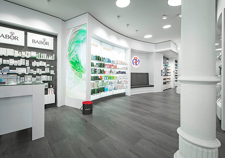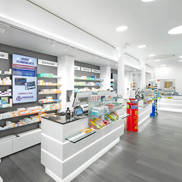 Die Medicus Apotheke wurde in eine verwinkelte Altbaufläche integriert. Gütler entwickelte eine Planung, die die komplexen Raumkonturen aufnimmt und gleichzeitig eine klare Wegeführung, gleichmäßig zugängliche Handverkaufstische und effiziente Abläufe ermöglicht – trotz herausfordernder baulicher Voraussetzungen.